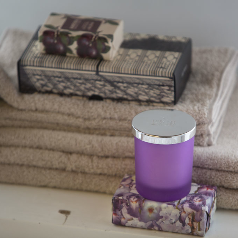 Vela Vaso Cristal, Violeta, Cera Vegetal con Esencia "Lavender & Geranium" - Ø 7,5x8,5 Altura. cm. / 6 Uds.